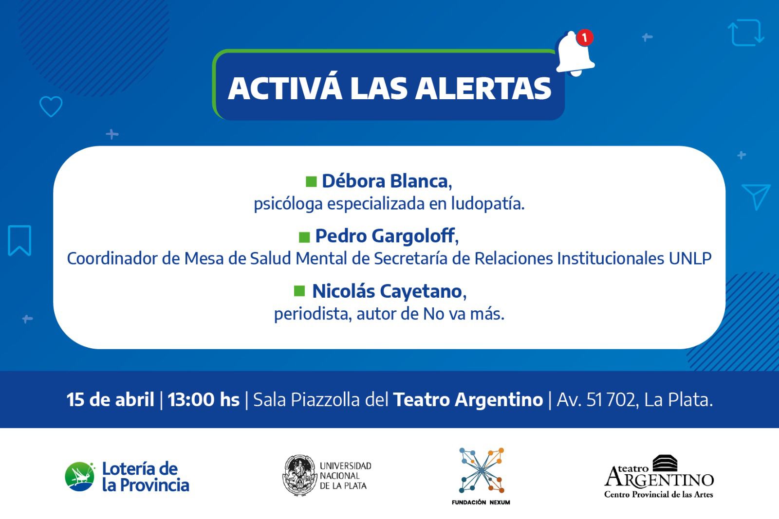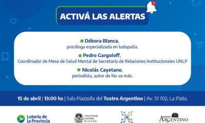 El próximo 15 de abril comenzará “Activá las alertas”, un ciclo de charlas destinado a concientizar sobre el consumo digital, prevenir la ludopatía y las apuestas ilegales. La propuesta es organizada por Lotería de la Provincia en conjunto con la Universidad Nacional de La Plata (UNLP) y la Fundación Nexum.