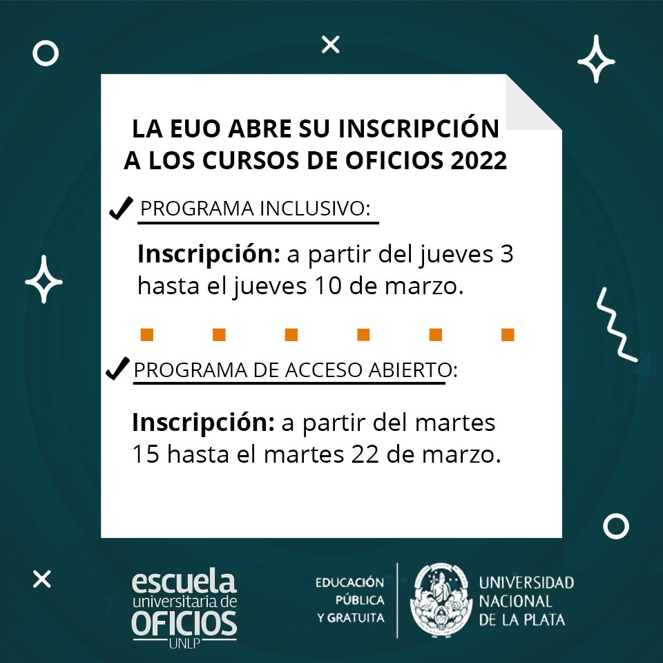 La inscripción será a partir del martes 15 hasta el martes 22 de marzo inclusive a través de un formulario online que estará disponible a partir de las 8hs de ese día las redes sociales de la Escuela de Oficios de la UNLP y en la página Web de la Universidad.