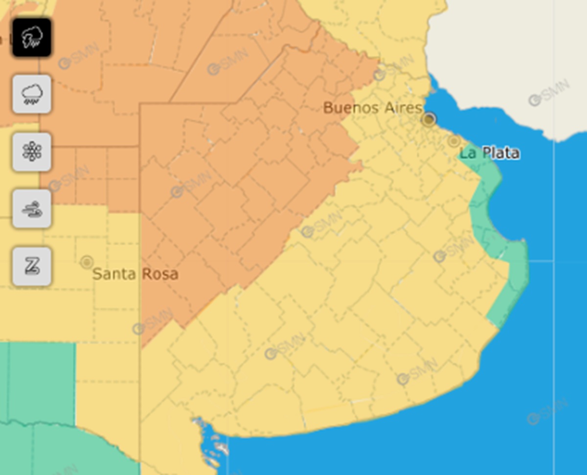 Los municipios incluidos en esta alerta son: Carhué, Guaminí, Salliqueló, Tres Lomas, Pellegrini, Daireaux, Henderson, Bolívar, Trenque Lauquen, América, General Alvear, General Villegas, Carlos Tejedor, Pehuajó, Carlos Casares, 9 de Julio, 25 de Mayo, Bragado, Los Toldos, Lincoln, Florentino Ameghino, General Pinto, Chivilcoy, Chacabuco, Junín, Vedia, General Arenales, Rojas, Salto, Carmen de Areco, Arrecifes, Pergamino, Baradero, San Pedro, Ramallo, Colón, San Nicolás y Capitán Sarmiento.