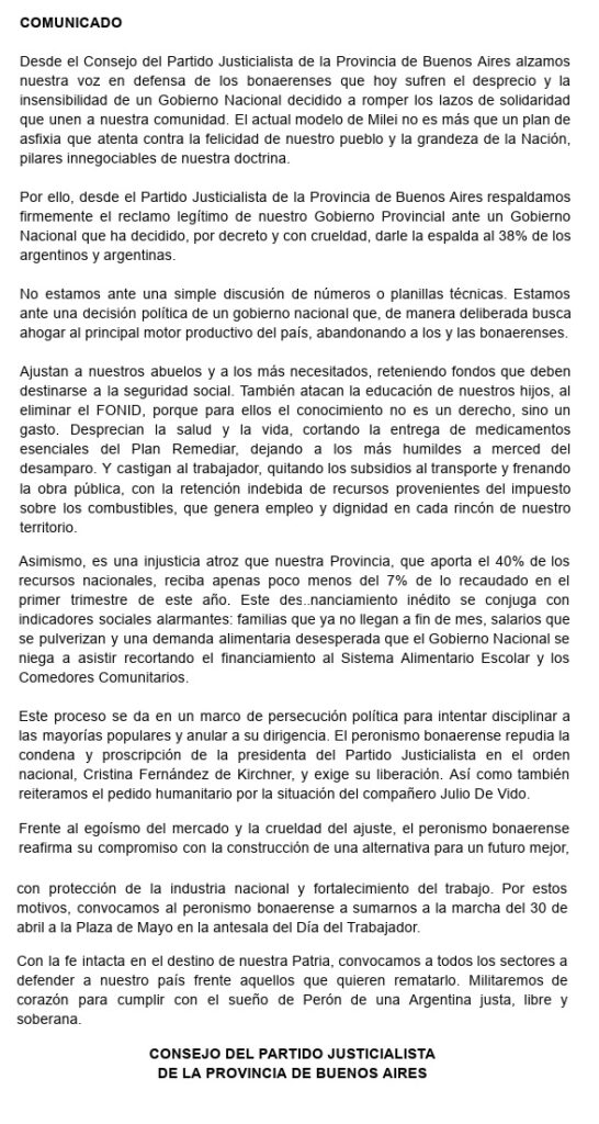En ese marco, el PJ bonaerense convocó a movilizarse el próximo 30 de abril a Plaza de Mayo, en la antesala del Día del Trabajador, con el objetivo de “defender a nuestro país frente a quienes quieren rematarlo”.