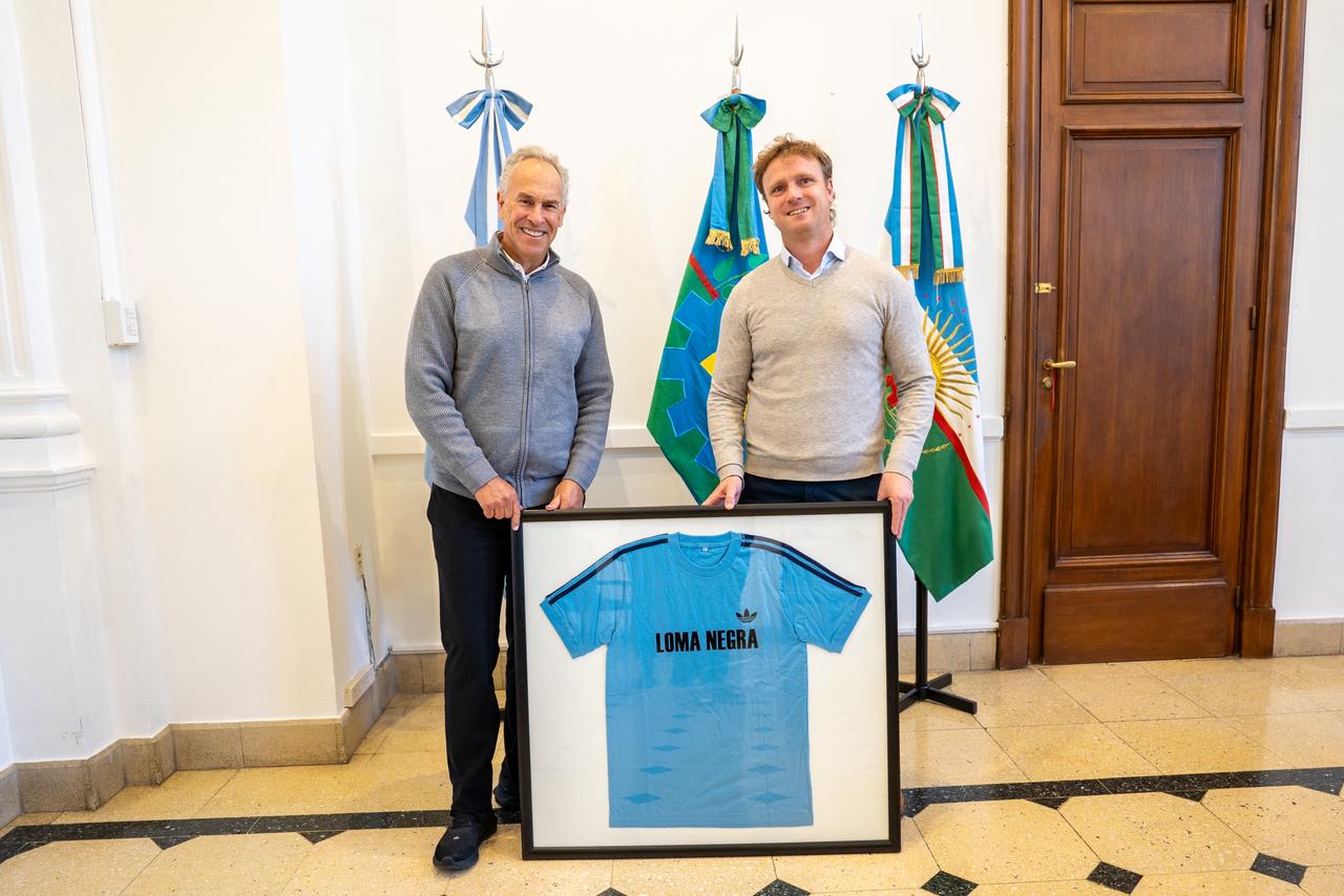 Marcelo Mindlin llegó a Olavarría, se reunió con el intendente Wesner y posó con la camiseta de Loma Negra