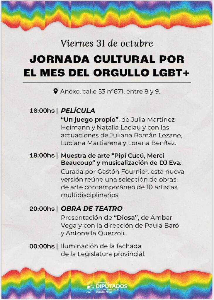 En el marco de una nueva vigilia por el mes del Orgullo LGBT+, la Cámara de Diputados de la provincia de Buenos Aires realizará el próximo viernes 31 de octubre distintas actividades en el Anexo de la HCD (Calle 53 entre 8 y 9 N° 671), con entrada libre y gratuita.
